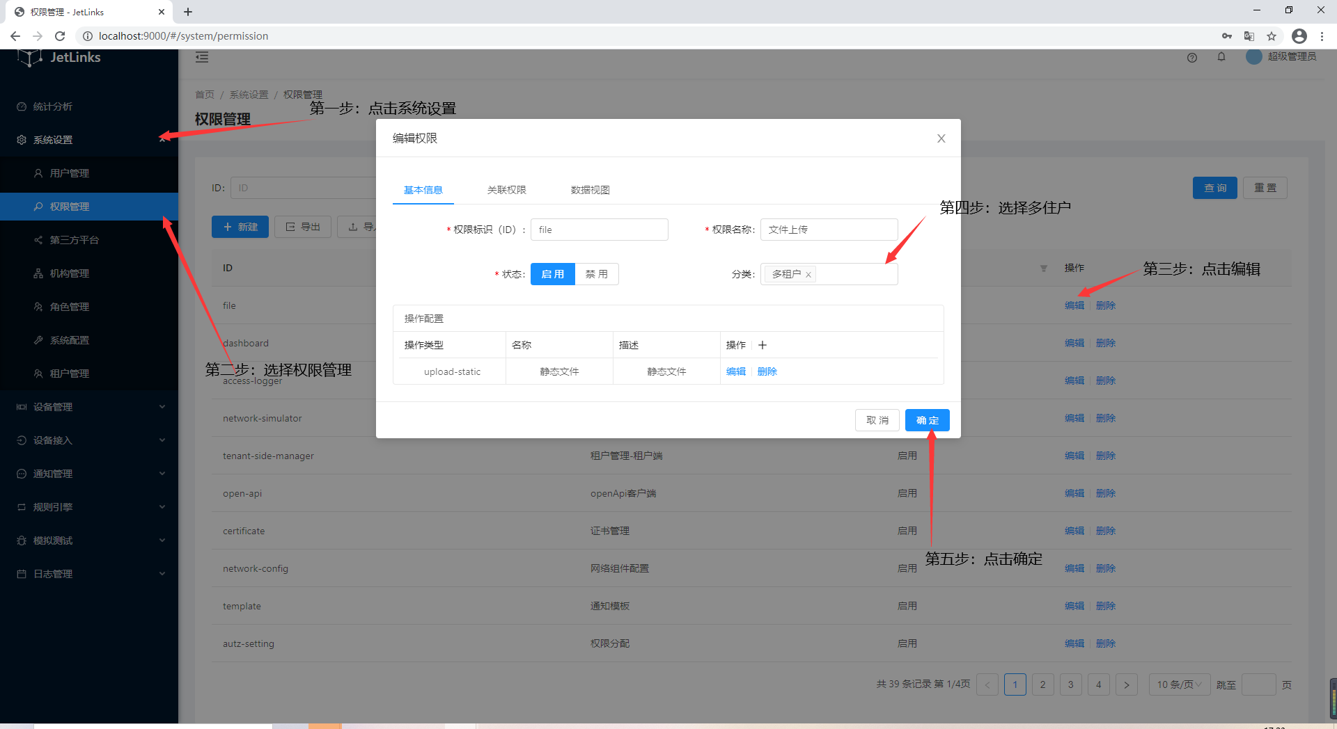1、进入系统:系统设置-权限管理-新建,然后在操作列点击编辑。